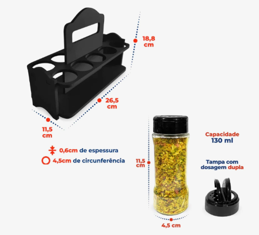 Com design moderno e funcional, ele permite que você tenha todos os seus temperos sempre à mão, facilitando o preparo das suas receitas no dia a dia.